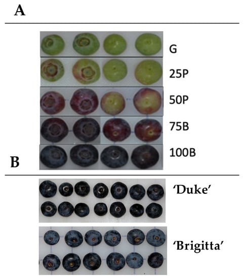 (A), Fruit developmental stages considered in this study (G, green; 25P, 25% pink; 50P, 50% pink; 75B, 75% blue; 100B, 100% blue). (B), Fully ripe ‘Duke’ and ‘Brigitta’ fruit.