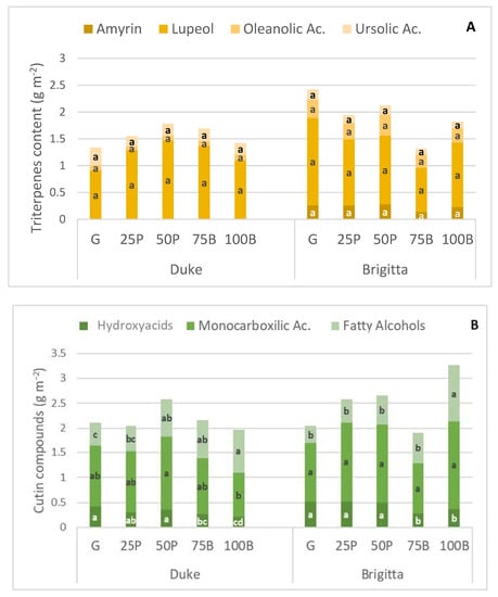 Amounts of cuticle triterpene (A) and cutin (B) components (g m−2) of ‘Duke’ and ‘Brigitta’ fruit, sampled at five developmental stages: green (G), 25% pink (25P), 50% pink (50P), 75% blue (75B), 100% blue (100B). For each cultivar and component, means with different letters across developmental stages, differ at p < 0.05 (Tukey’s test).