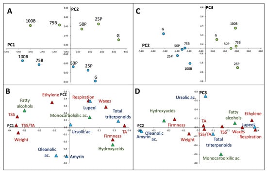 The scores plot of PC1 and PC2 (Figure 3A) showed that samples of both cultivars distributed progressively along PC1 from the most immature stage (G) to stage 100B, with the physicochemical characteristics (i.e., TSS, TA, TSS/TA, weight, wax yields, and firmness) as the most relevant variables for sample differentiation (Figure 3B). A clear separation between cultivars was observed along PC2, which was associated with two physicochemical variables (ethylene production and respiration rates) and with some triterpenes (α-amyrin, lupeol and oleanolic acid). When PC2 was contrasted with PC3 (Figure 3C), cultivar differentiation along PC2 was also observed. No clear trend was found across PC3, except that ursolic acid and monocarboxylic acids were the variables showing the most weight for sample separation along this axis (Figure 3D).