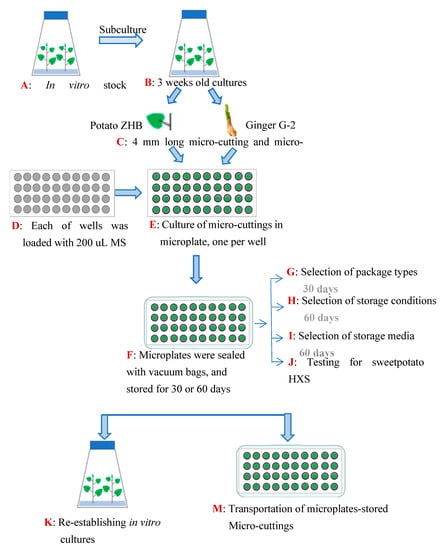 The micro-cuttings of ZHB and G-2 derived from routinely propagated in vitro plants were maintained in 1/4 MS medium supplemented with 100 mg/L CCC (1/4MS 100 CCC medium) in sterilized microplates (Figure 2a–c). The plates were then vacuum-sealed with non-sterile packages (Figure 2d,e). The cultures were maintained at 10 °C in the dark (Figure 2f). Micro-cuttings were transplanted into MS medium after 60 days of incubation, and incubated under normal culture conditions. The regrowth capacity in terms of percentage of shoots resuming normal growth was evaluated 30 days after sample release (the 1st cycle of culture). The subculture and incubation of recovered ZHB and G-2 plants were repeated (the 2nd cycle of culture). The regrowth capacity and morphology indices were measured as well. In order to test the feasibility of the present method in other plant species, sweet potato HXS in vitro cuttings (0.4 mm long shoot with one 0.2 mm petiole) were harvested and transplanted in sterilized microplates supplemented with 1/4 MS 100 CCC medium. The plates were vacuumized and maintained at 10 °C in the dark for 60 d, followed by analysis of the survival and regeneration (Figure 1J,K).