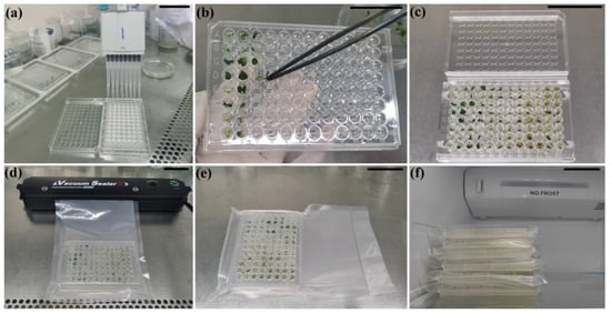 Manufacturing procedures of microplate shipping of vacuum-packed plant micro-cuttings. (a) Loading each of microplate well with 200 uL 1/4MS 100 CCC medium; (b) micro-cutting culture; (c) cutting cultured plate; (d) vacuumization; (e) vacuum-packed plate; (f) packaged plates stored at 10 °C in the dark (light on state in picture). Bar indicates 5 cm.