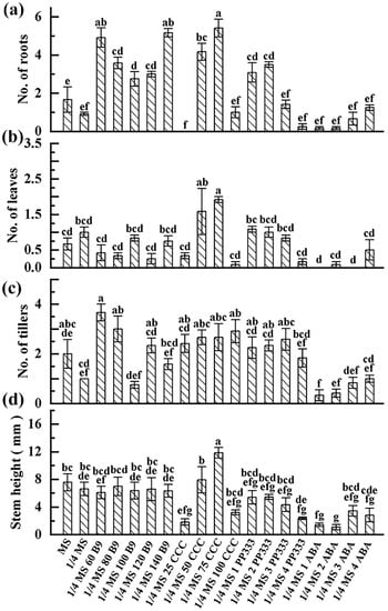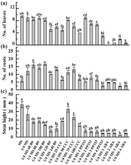 Morphology indices of in vitro plants under each treatment were measured. For ZHB, compared to MS medium, 1/4 MS medium significantly increased the roots but decreased the shoot growth; no obvious changes on other morphological indexes were observed. Following 1/4 MS-medium-based treatment, 60–100 mg of B9 did not significantly affect the regeneration of leaf and root, while 120–140 mg of B9 inhibited it; however, the elongation of the shoot was reduced regardless of dose. Treatment with 25 and 100 mg of CCC suppressed potato growth whereas 50 and 75 mg did not, while 100 mg of CCC generated the shortest plantlets among all CCC treatments. ABA addition resulted in the lowest average number of leaf, root, and stem height on potato ZHB in general, followed by PP333 supplementation (Figure 4). For ginger G-2, decreasing the iron content to 1/4 inhibited rooting and tillering. Regeneration and growth were enhanced by B9 and PP333 depending on the dose. Exposure to 50 and 70 mg of CCC improved the development of roots, leaves, and stems, while 25 and 100 mg doses significantly inhibited all indices, except for the number of tillers. The low regrowth rate under ABA treatment resulted in the shortest and the most undeveloped G-2 plantlets (Figure 5).