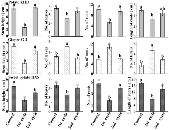 Similar patterns of vegetative generation of preserved ZHB and HXS recovered from packed microplates were observed (Figure 6). Generally speaking, the stem height, number of leaves, number of roots, and length of roots were significantly short and few in the 1st cycle of cultured micro-cuttings; however, this inhibition was reversed by further subcuture. The vegetative growth of plantlets was restored to similar levels after another cycle of subculture compared to untreated plants, except for the stem height of sweet potato HXS, which was shorter than in the control after the 2nd cycle of subculture (Figure 6). The average stem height for ginger G-2, similar to ZHB and HXS, was significantly inhibited by the packaging and recovered following successive subculture. However, the growth and differentiation of leaves, roots, and tillers were significantly stimulated by the packaged conservation, and these changes were temporary as well; the growth of cuttings resumed to control levels following the 2nd cycle of subculture (Figure 6). No malformation or changes in morphology of plantlets were observed (Figure S1).