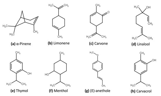 Several Apiaceae species are an excellent source of EOs, which contain more than 760 different chemical components [1,2]. The chemical composition varies with the plant part used for extraction, various extraction methods, phenological stages of the plant, harvesting season, plant age, soil nature, and environmental conditions. These variations in chemical composition have a direct effect on their biological activities [15,16]. Knowledge of these chemical constituents is vital to make use of this economically important plant family, not only for medicinal benefits, but also for environmental applications. Essential oils and their components, mainly monoterpenoids and sesquiterpenoids, show antimicrobial, repellent, chemosterilant, antifeeding, and other biocidal activities [17,18]. Table 1 shows some Apiaceae species and their major components, while Figure 1 shows the chemical structure of several main components.
