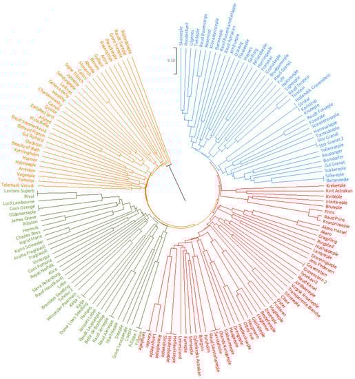 - Skytte af Sätra, J.; Troggio, M.; Odilbekov, F.; Sehic, J.; Mattisson, H.; Hjalmarsson, I.; Ingvarsson, P.K.; Garkava-Gustavsson, L. Genetic Status of the Swedish Central collection of heirloom apple cultivars. Sci. Hortic. 2020, 272, 109599. [Google Scholar] [CrossRef]