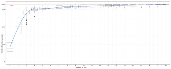 In order to quantify a potential increase in genetic identity accuracy, achieved through the use of additional 12 SSR markers, the concordance in terms of synonyms, homonyms, and duplicates between the present and 2016 study was examined. The accessions “Åkerø” and “Åkerø Hassel”, although possessing very similar names, differed in four SSR loci. However, in the 2016 study, “Åkerø Hassel”, and “Åkerø” had identical genetic profiles on all eight of the analyzed loci. The accessions “Fosseple” from Njøs and “Raudt Fosseple” were determined to be genetically identical in the 2016 study, while the use of additional SSR markers found a difference between the two accessions in three SSR loci. However, these differences were only in terms of 2 bps. As “Raudt Fosseple” (eng. “Red Fosseple”) and “Fosseple” are genetically very similar and their names vary only in the prefix raudt or red, it is reasonable to assume that “Raudt Fosseple” probably is a red mutant. The accessions “Raud Torstein” and “Torstein” differed in only 2 bps on one of the 20 SSR loci, while these accessions were indistinguishable in the 2016 study, due to the use of a limited number of SSR loci. The accessions “Laxtons Superb” and “Lord Lambourne” were determined to be synonyms in the 2016 study, whereas in the 2021 study, the use of additional SSR markers managed to show a clear difference in SSR profiles in five of the additional loci analyzed here. The accessions “Prins” and “Kronprinseple”, were determined to be synonyms in the 2016 study. However, these two, as well as a third accession carrying the name “Prins” (“Raud Prins”), slightly differentiated with the use of a much larger set of SSR loci. Namely, “Raud Prins” and “Kronprinseple” differed in one locus, “Raud Prins” and “Prins” differed in two loci, while “Prins” and “Kronprinseple’ differed in three of the 20 loci. It is important to note that these differences were only in terms of 2 to 4 bps, still making these accessions genetically highly similar. Overall, the use of a larger set of SSR markers gave more accurate insight into the genetic identity of the apple germplasm maintained in Norwegian ex situ collections. However, it is hard to quantify if this deeper insight justified the extra cost of employing an additional 12 SSR markers. Namely, using an accumulation curve approach (Figure 2), it was determined that only six SSRs, of the 20 analyzed in the study, were sufficient to differentiate all accessions with a differing SSR profile. However, it is worth noting that diversity studies rarely rely on markers exclusively for the differentiation of individual accessions, but also for investigating genetic relationships and underlying the genetic structure, where the use of additional markers can be beneficial. Aside from this, the collection would benefit greatly from a thorough pomological characterization, which would add a new dimension to the obtained molecular data. Joint molecular and phenotypic data should serve as a sound basis for the exclusion of any redundancies identified in this study. The benefits of joint the evaluation of genetic and phenotypic characteristics were recently reported by Wiehle et al. [].