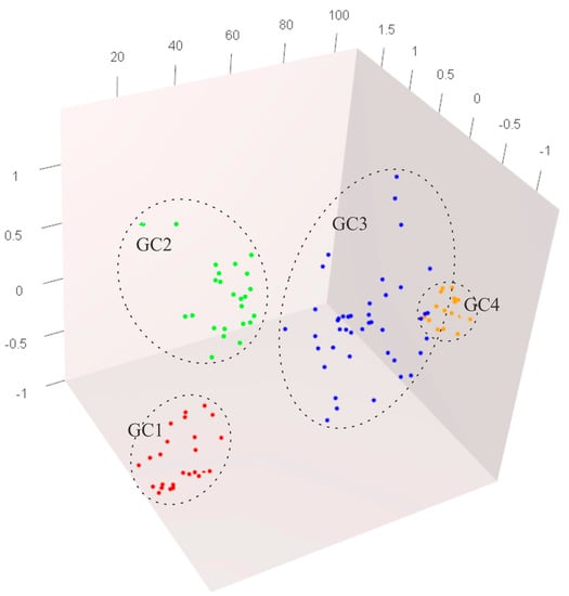 An analysis of molecular variance (AMOVA) carried out on the previously described GCs revealed that a significant part of the variance (14%; p < 0.01) was ascribed to differences among the analyzed four GCs, indicating a significant genetic differentiation between these groups. A factorial correspondence analysis (FCA) (Figure 3) displayed an overlap between the GCs containing old English varieties (GC3 and GC4), while the remaining two GCs clearly separated from each, as well from the GCs containing foreign cultivars. In general, the analyses of the genetic structure conducted on the accessions maintained at the apple heritage cultivar collection in Ullensvang, indicate a more complex structure compared to the results of the previous study on Norwegian apple germplasm. Namely, Gasi et al. [] reported that all analyzed apple accessions maintained in six ex situ collections were classified into two main GCs. The first one containing traditional Scandinavian cultivars, while the second GC including international cultivars, as well as numerous old apple cultivars introduced to Norway from western Europe and North America. The added sub-structuring obtained in this study could be a consequence of more detailed genetic information gathered through the use of an additional 12 SSR markers.