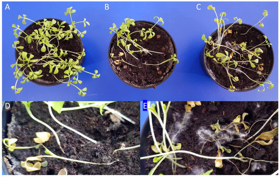 Figure 1. Photograph of healthy (A) and Rhizoctonia- (B) and Sclerotinia-diseased (C) cress seedlings sown in pots on autoclaved peat. Details of the damping-off by Rhizoctonia solani (D) and the wilting of cress seedlings covered by Sclerotinia sclerotiorum mold (E).