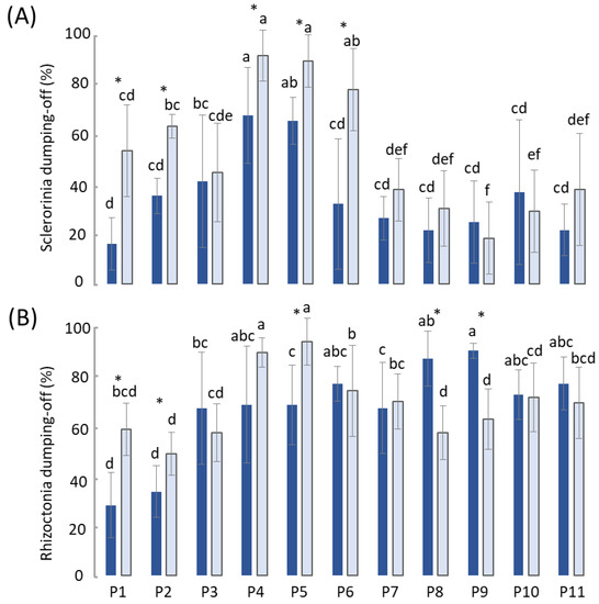 Percentage of Sclerotinia (A) and Rhizoctonia (B) damping-off on cress seedlings in raw (dark blue bars) and autoclaved (light blue bars) composts diluted into peat. Lowercase lettering indicates significant differences (p ≤ 0.05), according to the Least Significant Difference post hoc test, among both the raw and autoclaved samples. Asterisk indicates significant differences (p ≤ 0.05), according to the Least Significant Difference post hoc test, between the raw and autoclaved samples of the same compost.