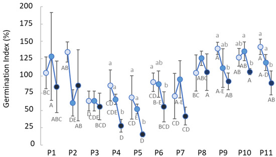Germination index of cress seeds exposed to compost water extracts (P1 to P11) at 50 (dark blue), 16.6 (medium blue) and 5 g L−1 (light blue). Lower and uppercase lettering indicate significant differences (p ≤ 0.05), according to the Least Significant Difference post hoc test, among the concentration within the same sample and the sample within the same concentration, respectively.