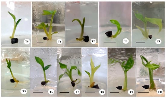 Seedling growth of black cardamom at the 110th day under different seed treatments: T0—Control; T1—ME (soak in water for 24 h + scarify by scalpel); T2—HW2m (soak in hot water at 100 °C for 2 min); T3—HW4m (soak in hot water at 100 °C for 4 min); T4—CW (soak in cold water for 24 h); T5—NAS10m (soak in 50% HNO3 for 10 min); T6—NAS15m (soak in 50% HNO3 for 15 min); T7—HAS10m (soak in 25% HCl for 10 min); T8—HAS15m (soak in 25% HCl for 15 min); T9—GA324h (soak in 200 ppm GA3 for 24 h); T10—NAA24h (soak in 200 ppm NAA for 24 h). Scale bars = 1 cm.