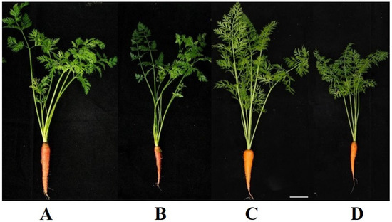 Phenotype of carrot under salt stress. (A) ‘BHJS’ CK; (B) ‘BHJS’ under salt stress; (C) ‘KRD’ CK; (D) ‘KRD’ under salt stress. Bar = 5 cm. Salt Stress: NaCl solution (300 mmol·L−1). CK: Distilled water.