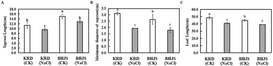 Morphological parameters of carrot under salt stress. (A) Taproot length; (B) Maximum diameter of taproot; (C) Leaf length. Different lowercase letters indicate significant differences among different carrot cultivars and treatment at the p < 0.05 level.