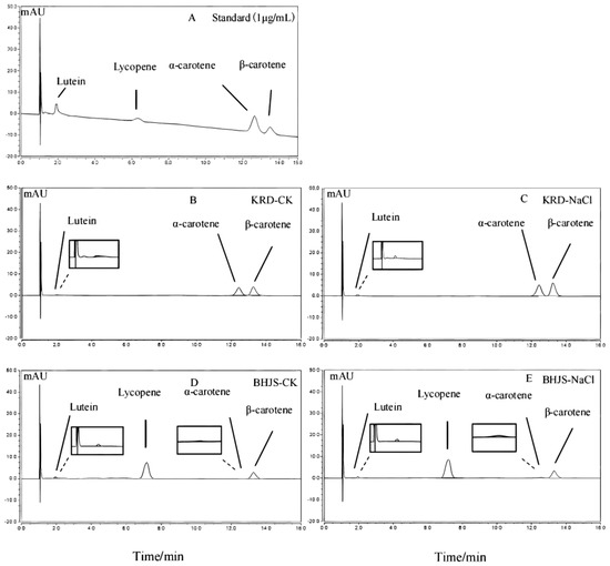 UPLC chromatograms of carotenoids in different carrot cultivars and treatments. (A) Standard UPLC chromatograms of carotenoids; (B) UPLC chromatograms of carotenoids in ‘KRD’ of control group; (C) UPLC chromatograms of carotenoids in ‘KRD’ of salt treatment group; (D) UPLC chromatograms of carotenoids in ‘BHJS’ of control group; (E) UPLC chromatograms of carotenoids in ‘BHJS’ of salt treatment group. Cultivar abbreviations: BHJS, Benhongjinshi; KRD, Kurodagosun.