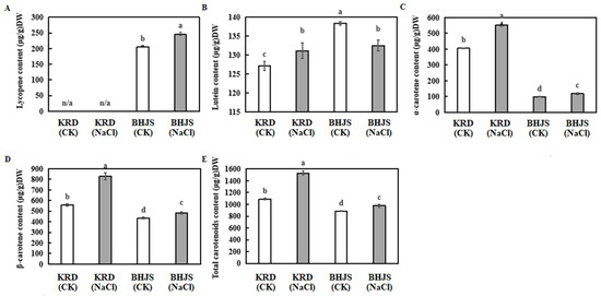 The accumulations of α-carotene, β-carotene and total carotenoids in the taproots of ‘KRD’ and ‘BHJS’ were activated under the salt stress treatment. Lycopene was barely detected in the taproot of ‘KRD’ in both the control and the salt treatment group, but a high concentration of lycopene was detected in the control group and salt treatment group of ‘BHJS’, 205.37 μg/g and 244.66 μg/g, respectively, reflecting the difference in lycopene concentration in the taproots of ‘KRD’ and ‘BHJS’. The lutein concentration in the taproots of ‘KRD’ and ‘BHJS’ increased and decreased significantly, respectively, under salt treatment (300 mmol·L−1 NaCl), reflecting the difference in the mechanism of lutein response to salt stress between ‘KRD’ and ‘BHJS’.