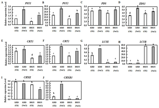Relative expression levels of carotenoid biosynthesis-related genes under salt stress. (A) Relative expression level of PSY1 in the roots of ‘BHJS’ and ‘KRD’ under different treatment; (B) PSY2; (C) PDS; (D) ZDS1; (E) CRT1; (F) CRT2; (G) LCYE; (H) LCYB; (I) CHXE; (J) CHXB1. Different lowercase letters indicate significant differences among different carrot cultivars and treatment at the p < 0.05 level.
