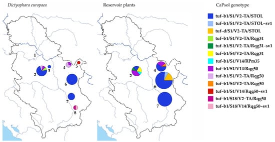 Overall, thirteen tuf/secY/vmp1/stamp comprehensive ‘Ca. Phytoplasma solani’ genotypes were detected in the surveyed localities (Figure 1). The isolates of D. europaea harbored seven CaPsol genotypes, while eight were detected in natural plant reservoirs. Among them, nine corresponded to previously identified genotypes [,,,]. New MLSA genotypes tuf-b1/S1/V14/Rqg50-sv1 and tuf-b1/S18/V14/Rqg50-sv1 were found in D. europaea. New MLSA genotype tuf-b1/S1/V2-TA/Rqg31-sv1 was found in C. arvensis, whereas tuf-b1/S1/V2-TA/STOL-sv1 was shared by two hosts, C. foetida and D. carota.