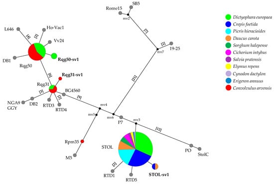 Median-joining network inferred from stamp genotypes of ‘Candidatus Phytoplasma solani’ strains detected in naturally infected Dictyophara europaea and reservoir plants in this study and those previously identified in the Balkans [,,,,,]. Genotypes PO and StolC originating from France [] were used for stabilization of the network. Genotypes are represented by circles and paired genotypes are connected by a line. Circle sizes are proportional to the strain frequency found in this study and colors correspond to the associated host as shown in the figure legend. Each line connecting the circles is one mutational difference. For more than one mutational difference between strains, numbers of SNP mutations are presented in brackets; black dot vertices represent median vectors (mv). Gray circles represent reference strains not detected in this study. Strain and vector abbreviations are indicated. Newly detected strains designated in this study are in bold.