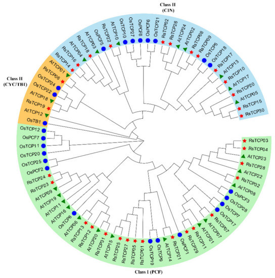 To better clarify the phylogenetic relationships among the predicted RsTCPs, the 32, 25, and 24 TCP proteins identified from radish, rice, and Arabidopsis were aligned using the ClustalW program, and then an un-rooted phylogenetic tree was constructed using MEGA X (Figure 1). The result showed that these 81 TCP proteins could be clustered into two categories (Class I and Class II) and three groups (PCFs, CINs, and CYCs). The Class I (PCF) subgroup contained 44 members (54.32%), including 17 RsTCPs, 14 OsTCPs, and 13 AtTCPs, respectively. Class II included CIN and CYC/TB1 types. Among them, 13 RsTCPs, 8 OsTCPs, and 8 AtTCPs belonged to the CIN subgroup, while 2 RsTCPs, 3 OsTCPs, and 3 AtTCPs were categorized into the CYC/TB1 type, accounting for 9.88% of the total. In addition, the result also showed that the relationship of TCPs between radish and the dicot Arabidopsis was closer to that of the monocot rice.