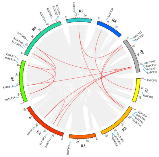 The chromosomal location and synteny analysis of the RsTCP family. Red lines indicate the collinear relation.