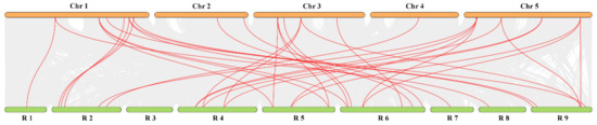 Synteny analysis of TCP genes between radish and Arabidopsis. Colored lines connecting two chromosomal regions indicate syntenic regions between radish (R1–9) and Arabidopsis (Chr1–5) chromosomes.