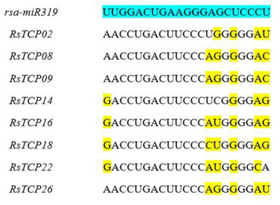 The target sites of rsa-miR319 in the RsTCP genes were predicted by psRNATarget online software, and it was found that eight putative genes contained rsa-miR319 recognition site, namely RsTCP02, RsTCP08, RsTCP09, RsTCP14, RsTCP16, RsTCP18, RsTCP22, and RsTCP26 (Figure 6), while the other RsTCP genes did not contain a putative rsa-miR319 recognition site. This result suggested that these eight putative genes may play more critical roles in the growth and development of radish than other RsTCP members.