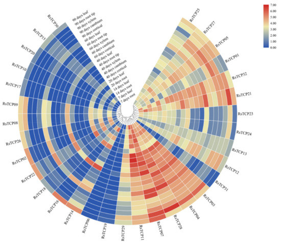 Expression profile of RsTCP genes in different stages and tissues.