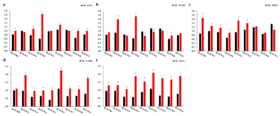 The expression of RsTCP genes after 24 h treatment in response to environmental shocks and phytohormones. (a) Low temperature treatment (44 °C); (b) NaCl (250 mM); (c) PEG6000 (15% w/v); (d) ABA (100 µM); (e) GA3 (100 µM). The RsActin gene was used as the internal control, and three biological and technical replicates were conducted. The relative expression levels of each gene were calculated using the 2−ΔΔCT method. Each bar shows the mean ± SE of the triplicate assay, and * indicates significant difference at p < 0.05 according to Duncan’s multiple range test.