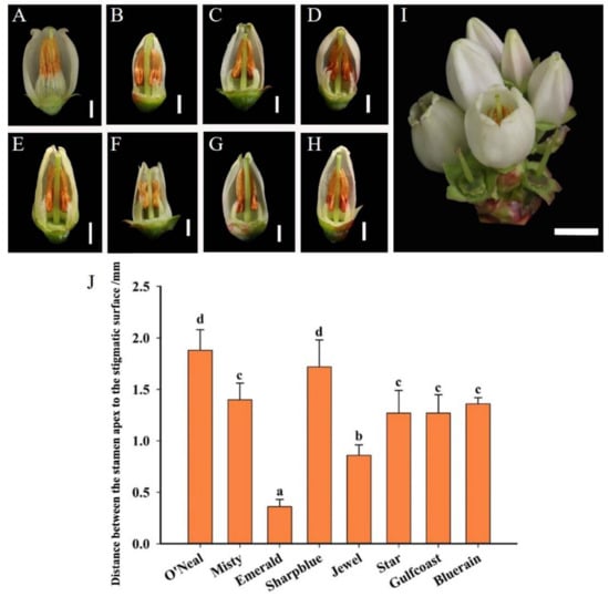 Floral diversity of eight southern highbush blueberry cultivars. (A) ‘O’Neal’; (B) ‘Misty’; (C) ‘Emerald’; (D) ‘Sharpblue’; (E) ‘Jewel’; (F) ‘Star’; (G) ‘Gulfcoast’; (H) ‘Bluerain’; and (I) Flowers of blueberry. Bar: A to H = 2 mm; I = 0.5 cm. (J) The distance between the stamen apex to the stigmatic surface. The X axis indicates different blueberry cultivars. Bars with different letter superscripts are significantly different from each other at the p < 0.05 level using Duncan’s test.