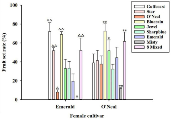 Differences of average seed number per fruit when ‘Emerald’ and ‘O’Neal’ pollinated with different SHB pollen donors. Note: △ p < 0.05, △△ p < 0.01, compared to ‘Emerald’ × ‘Emerald’; * p < 0.05, ** p < 0.01, compared to ‘O’Neal’ × ‘O’Neal’. Bars sharing triangles or stars are significantly different from each other using the Duncan’s test.