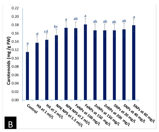 The data in Figure 1A,B reveal a significant effect of SNPs, NPK NPs, FeNPs, ZnNPs, and humic acid at all concentrations on leaf pigments of Philodendron plants compared to the control. It is clear that the best total chlorophyll content was obtained under FeNPs at 150 mg/L and SNPs at 60 mg/L treatments. Additionally, the highest value in chlorophyll content was obtained under FeNPs at 150 mg/L treatment. Moreover, the highest values in carotenoid content were obtained under NPK NPs at 2 mL/L, FeNPs at 150 mg/L, and SNPs at 60 mg/L treatments. The lowest concentration of all leaf pigments was obtained from the untreated plants. The highest values (1.14 mg/g FW for chlorophyll and 0.181 mg/g FW for carotenoid) were recorded when plants were sprayed with 150 mg/L FeNPs.