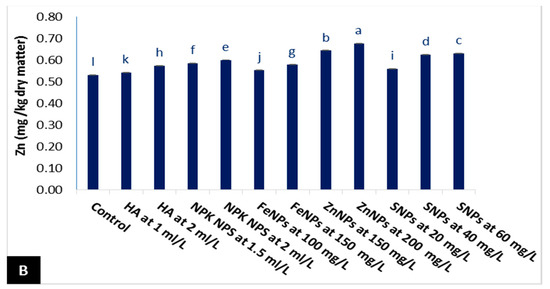 The results of our present study depicted that NPs (Ag, Fe, Zn, and NPK) and humic acid had significantly increased Fe (except for the SNPs at 20 mg/L treatment) and Zn contents in leaves of Philodendron plants compared to the control (Figure 2A,B). The foliar application FeNPs had significantly increased the Fe content in leaves compared with other treatments and the control plants (Figure 2A). The highest content of iron (1.75 mg/kg dry matter) was achieved when the plants were sprayed with 150 mg/L FeNPs, and the unsprayed plants recorded the lowest values of Fe content (0.80 mg/kg dry matter). As seen in Figure 2B, the recorded data revealed that plants treated with ZnNPs had significantly increased Zinc content in plant leaves compared to other treatments and the control plants. The highest mean values of Zn content were recorded for the treatment of 200 mg/L ZnNPs (0.68 mg/kg dry matter) while the lowest ones were recorded with the control plants (0.53 mg/kg dry matter).