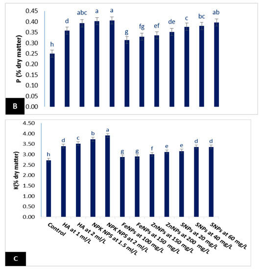 Regarding the effect of nanoparticles (Ag, Fe, Zn, and NPK) and humic acid on N, P, and K contents, the results in Figure 3A–C revealed that all treatments led to a great increase in N, P and K elements (%) in the leaves of Philodendron compared to control plants. The highest values of N (%) in the leaves were obtained with 2 mL/L NPK NPs followed by 1.5 mL/L NPK NPs, then SNPs at 60 mg/L. The highest value of nitrogen (4.44%) content in leaves was obtained with 2 mL/L NPK NPs, while the control recorded the lowest value (Figure 3A). As shown in Figure 3B, there were non-significant differences in phosphorus (%) between 2 mL/L NPK NPs, 1.5 mL/L NPK NPs, SNPs at 60 mg/L, SNPs at 40 mg/L, and HA at 2 mL/L. The highest value of P (%) was obtained with 2 mL/L NPK NPs, while the control treatment achieved the lowest values. The highest content of potassium was recorded in the leaves of the plants sprayed with NPK NPs treatments followed by Humic acid treatments; the highest values were recorded at 2 mL/L NPK NPs (Figure 3C). The lowest values of K contents were obtained in the control plants (2.72%).