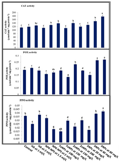 The obtained results indicated that humic acid and NPs (Ag, Fe, Zn, and NPK) treatments led to improvements in the up-regulation of enzyme activities, mainly catalase, peroxidase, and polyphenol oxidase in the leaves of Philodendron plants (Figure 4). The plants showed a higher CAT activity than the control when treated with SNPs at 60 and 40 mg/L, ZnNPs at 150 mg/L, FeNPs at 100 mg/L, and NPK NPs at 2 mL/L. Additionally, a higher POX activity was recorded in treated plants compared to the control when treated with HA at 2 mL/L, SNPs at 40 mg/L, SNPs at 60 mg/L, and ZnNPs at 150 mg/L nanoparticles. However, the plants showed a higher PPO activity compared to the control when treated with SNPs at 60 mg/L nanoparticles.