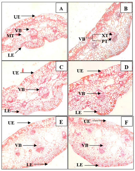 Anatomical structure of Philodendron bipinnatifidum leaves in the second season. (A): control, (B): NPK NPs at 2 ml/L, (C): ZnNPs at 200 mg/L, (D): SNPs at 20 mg/L, (E): SNPs at 40 mg/L, (F): SNPs at 60 mg/L, UE: Upper epidermis, MT: Mesophyll tissue, VB: Vascular bundle, XT: Xylem tissue, PT: Phloem tissue, LE: Lower epidermis (Magnification 100×).