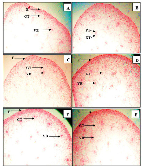 Anatomical structure of Philodendron bipinnatifidum stems in the second season. (A): control, (B): NPK NPs at 2 ml/L, (C): ZnNPs at 200 mg/L, (D): SNPs at 20 mg/L, (E): SNPs at 40 mg/L, (F): SNPs at 60 mg/L, E: Epidermis, GT: Ground tissue, VB: Vascular bundle, XT: Xylem tissue, PT: Phloem tissue (Magnification 100×).