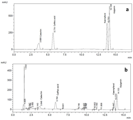 The determination of polyphenols was achieved by using the HPLC unit (Shimadzu Prominence Liquid chromatography, Japan), as per the experimental protocol conducted by Naik and Al-Khayri [12]. The mobile phases were 0.5% acetic acid in Millipore water (solvent A), methanol (solvent B) and acetonitrile (solvent C). A PVDF membrane filter (0.45 µm) was used to filter the mobile phase, and was then deaerated ultrasonically using a sonicator. The standards, catechin, caffeic acid and kaempferol (Sigma-Aldrich, St. Louis, MO, USA), were dissolved in methanol; apigenin was dissolved in solution containing 1:1 methanol and acetonitrile, and then all the standards were diluted with the mobile phase before injecting in the HPLC system. The concentration ranges of 1, 2, 5, 10, 30 and 40 µg/mL were used to develop a calibration curve. Solutions of standard compounds were chromatographed and served as external standards. When comparing the retention times of the standards, polyphenols of cell extracts were identified (Figure 1a,b). The quantities of each polyphenol present in the samples were expressed as µg/g.