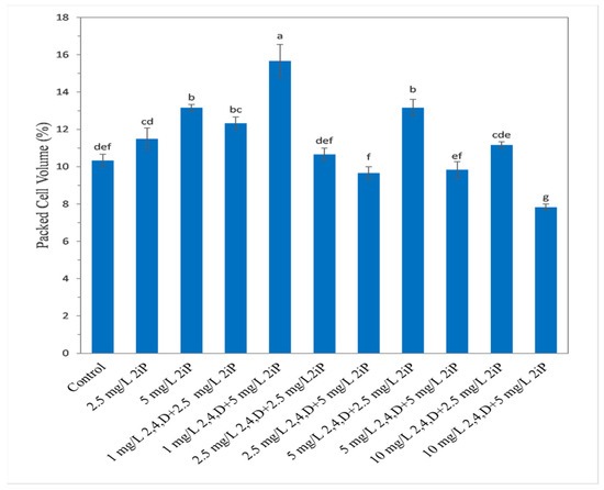 Effect of 2iP and 2,4-D on packed cell volume (%) in date palm cell suspension culture. At the eleventh week of culture, data were recorded. Line bar represents the standard error (SE). The same letters indicate no significant difference according to DMRT at p ≤ 0.05.