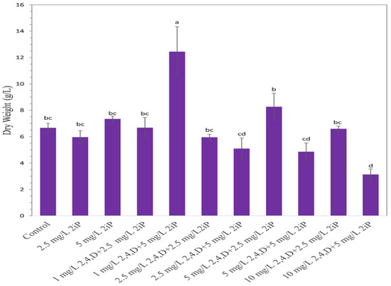Effect of 2iP and 2,4-D on dry weight (g/L) in date palm cell suspension culture. At the eleventh week of culture, data were recorded. Line bar represents the SE. The same letters indicate no significant difference according to DMRT (p ≤ 0.05).