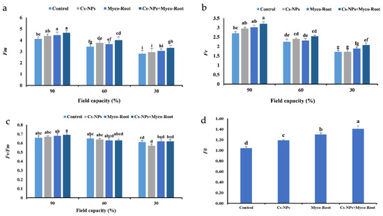 Fm, Fv and Fv/Fm ratio was significantly impacted by the interaction of irrigation levels and fertilizer application (Table 3). The highest Fm and Fv and Fv/Fm values were found in 90% FC treated with Cs-NPs+ Myco-Root (Figure 2a–c). Compared with normal irrigation, the Fm, Fv and Fv/Fm values decreased by 15.7, 19.9, and 5.9% in moderate water stress and by 30.9, 37.7, and 10.3% in severe water stress conditions, respectively. In contrast, integrative application of Cs-NPs+ Myco-Root enhanced the Fm and Fv by 15.9 and 17.6% compared with the control, respectively (Figure 2a,b).