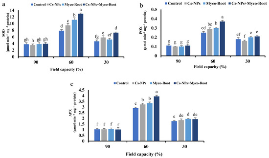 In this study, the application of fertilizer sources under different irrigation levels had a significant impact on antioxidant enzymes activity (Table 3). The highest SOD (12.96 µmol min−1 mg−1 protein), APX (3.94 µmol min−1 mg−1 protein) and POX (0.37 µmol min−1 mg−1 protein) activities were obtained under moderate water stress (60% FC) treated with Cs-NPs+ Myco-Root. The antioxidant enzymes activity was enhanced by increasing water stress levels. In comparison with normal irrigation, the activity of SOD, APX and POX was enhanced by 176, 220 and 173% under moderate water stress, and by 53, 78 and 73% under severe water stress, respectively. Moreover, co-application of Cs-NPs+ Myco-Root increased the three mentioned enzymes’ activity by 48, 21, and 28% when compared with the control, respectively (Figure 4a–c).