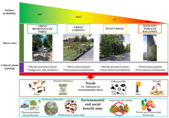 Schematic representation of the multilayered framework of the most common contexts, here defined as Macro Areas, found in an urban environment. In each macro area, the goals to achieve are multiple and specific, depending on the characteristics and needs of every specific zone, and specific vegetation type that is desired to use. However, under all conditions, the need to use specific cultural plant typology able to cope and tolerate environmental stresses is a fundamental requirement. In addition, the potential environmental and social benefits deriving from them are indicated. Details are described in the text.