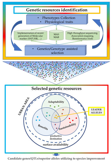 In conclusion, as summarized in Figure 2, the characterization of the urban vegetation with the best genetic profiles represents the new green challenge in urban planning to have the right genetics in the right place. A simplification and hierarchization of the main aspects that characterize an urban context, such as the surface availability, productive destination, adaptability, sustainability, and benefits contribution (details are reported in the text), play a key role in a breeding program. The identification of more appropriate starting genetic resources, by phenotype collections and physiological traits, is fundamental for the identification of appropriate traits/donors/parents and subsequent crossing programs. The potential application of molecular MAS and MAB and computational tools for performing genetic and/or genomic-assisted selection. Data generated through these trials can be used in the selection of specific leader alleles that can be introduced in species improvement programs for the constitution of new varieties that respond in a more targeted way to different needs in an urban area.