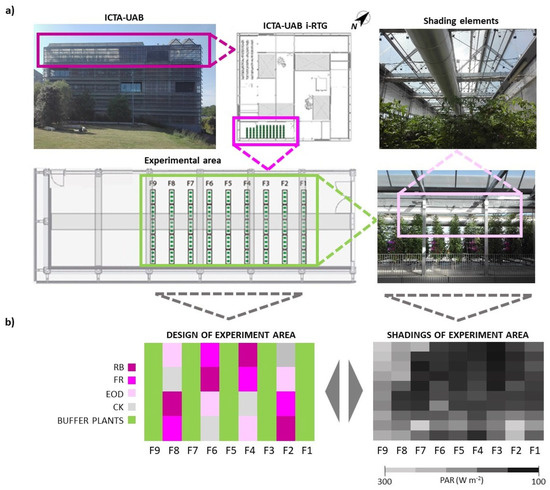 Location, experimental area, and shading elements of the i-RTG at ICTA-UAB (a). Experimental design and heatmap of internal shadings of experiment area (b).