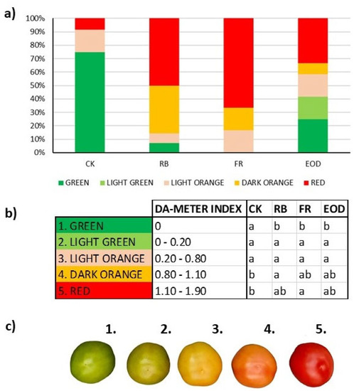 Comparison of multiple proportions (a) and respective significance (p ≤ 0.05) (b) for five tomato maturation classes (c) depending on lighting treatment applied to fruits of Follow-up 2. (different letters indicate significant differences at p ≤ 0.05).