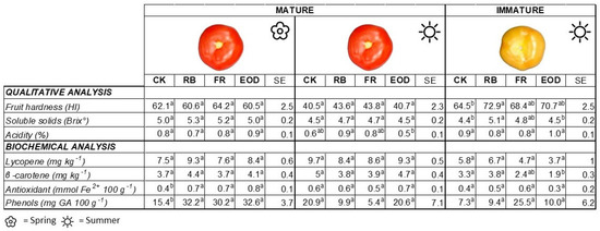 Qualitative and biochemical parameters showed different trends depending on the period in which the fruits developed (e.g., spring or summer) and the ripening stage at harvest (e.g., mature or immature) (Figure 4). In particular, observing representative fruits from the spring period, no significant differences were observed concerning the evaluation of qualitative parameters. However, a significantly lower content of antioxidants and phenols was observed in control fruits’ phenol content and antioxidant capacity compared with those grown with LED light treatments (Figure 4). In the case of summer fruits harvested at the mature stage, qualitative analyses showed lower acidity in fruits from the EOD treatment than the RB treatment (a reduction by 44.4% in EOD compared with RB), but no difference at the biochemical level. Finally, the evaluation of immature fruits, carried out only for the summer period, showed significantly higher hardness in fruits obtained from the RB treatment as compared with those produced by CK plants (11.5% less in CK compared with RB), and significantly higher soluble solid content in the RB than CK and EOD (13.7% less in CK and EOD compared with RB). For the biochemical analysis, the immature fruits from the summer period had a statistically significantly lower β-carotene content than RB and CK treatments (Figure 4). FDMC of selected fruits did not show any significant difference among treatments (data not shown).
