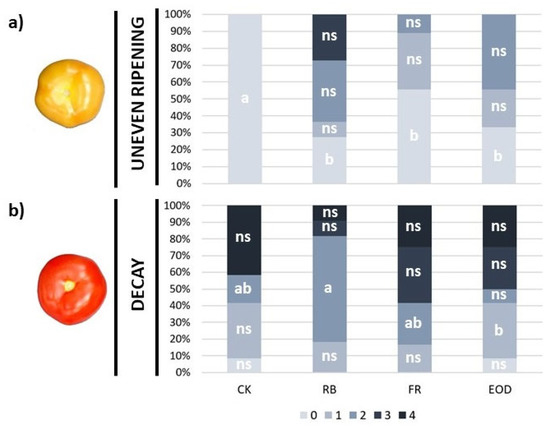 Chilling injury index was visually attributed at T2 according to Vega-Garcìa et al. [26] and Affandi et al. [27]. In particular, the criteria to evaluate the symptoms of chilling damage consisted of: uneven ripening and color development (U), pitting (P), and decay (D). A five-point scale was used to attribute the severity of the symptoms based on the percentage of affected fruit surface: 0 = no injury, 1 ≤ 10%, 2 = 11% to 25%, 3 = 26% to 40%, and 4 ≥ 40%.