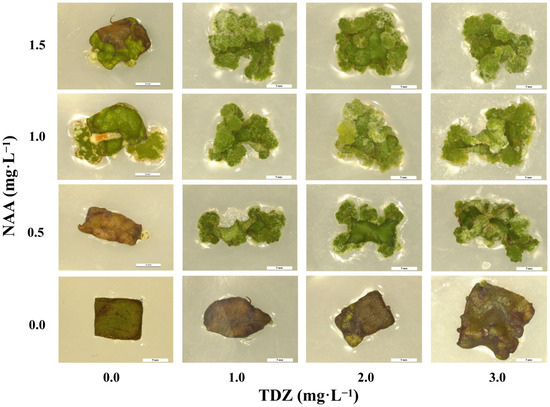 There was no contamination during callus induction. The explants began to differentiate calli after a two-week cultivation. One and a half months later, the morphology of the calli in each treatment was recorded and is shown in Figure 1. The TDZ alone hardly induced calli (Table 1), while NAA alone, especially at a concentration of 1.0 mg·L−1 successfully induced calli. All combinations of TDZ and NAA induced profuse calli, and the weights of calli increased with the increased concentration of NAA when TDZ was at the same level. The callus weights also increased with higher concentration of TDZ when NAA was at 0.5 or 1.0 mg·L−1. However, there were no significant differences as TDZ concentrations varied when NAA was at a concentration of 1.5 mg·L−1. Moreover, all the treatments, except for treatments without NAA, produced green compact calli, and those calli were covered with a layer of white vigorous cells, indicating that those calli had similar quality regardless of callus weight (Figure 1). The F-test indicated that both NAA and TDZ significantly affected the callus induction in C. wilsonii.