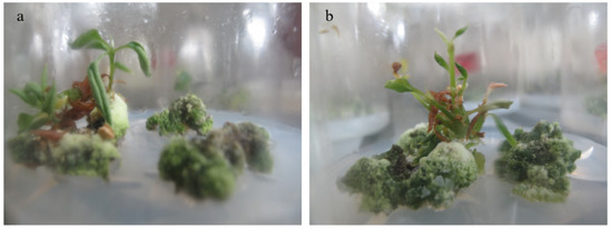 Shoots induced from calli in Cotoneaster wilsonii: (a) treatment with 0 mg·L−1 TDZ and 1.0 mg·L−1 BA; and (b) treatment with 1.0 mg·L−1 TDZ and 0 mg·L−1 BA.