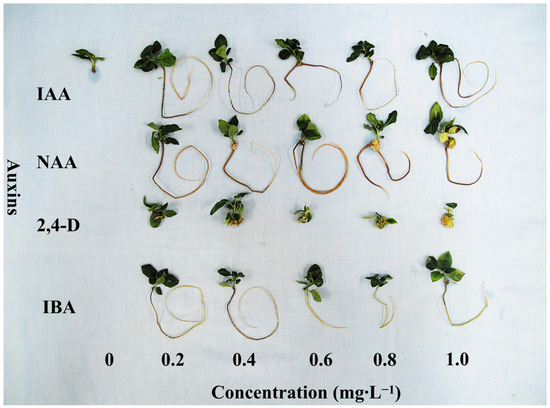 The auxins IAA, NAA, and IBA induced, while 2,4-D hardly induced roots in half-strength MS medium (Figure 3 and Table 3). IAA at a concentration of 0.8 mg·L−1 resulted in the greatest root induction ratio (70%). The application of 0.8 mg·L−1 IBA induced the greatest number of roots (1.8) per rooted plant, and IBA at 0.4 mg·L−1 produced the longest root, at an average of 19.6 cm. No contaminated plantlets were found during root induction.
